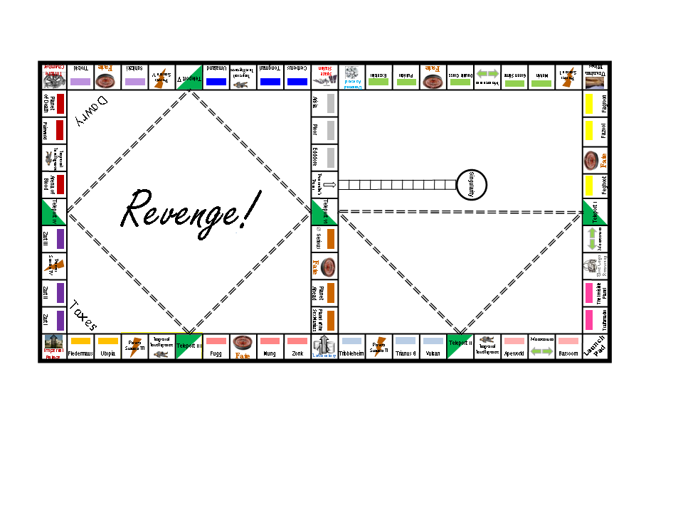 Vulchurella's groom takes her on a honeymoon of two clockwise turns around the board. You may use either the short route (via the Space Station to Laboratory leg) or the long route (via the Uranium Mines to Launchpad leg). Neither the groom nor the bride may teleport. Vulchurella moves one square behind the groom (symbolized by a ring). She cannot buy property or collect cards. He pays rent for both of them out of his own funds; he cannot use the Dowry until the honeymoon is over. If other players play cards on him, she follows, one step clockwise behind him. The Laboratory Geas does not apply, and the groom may pass free through the Torture Chamber.